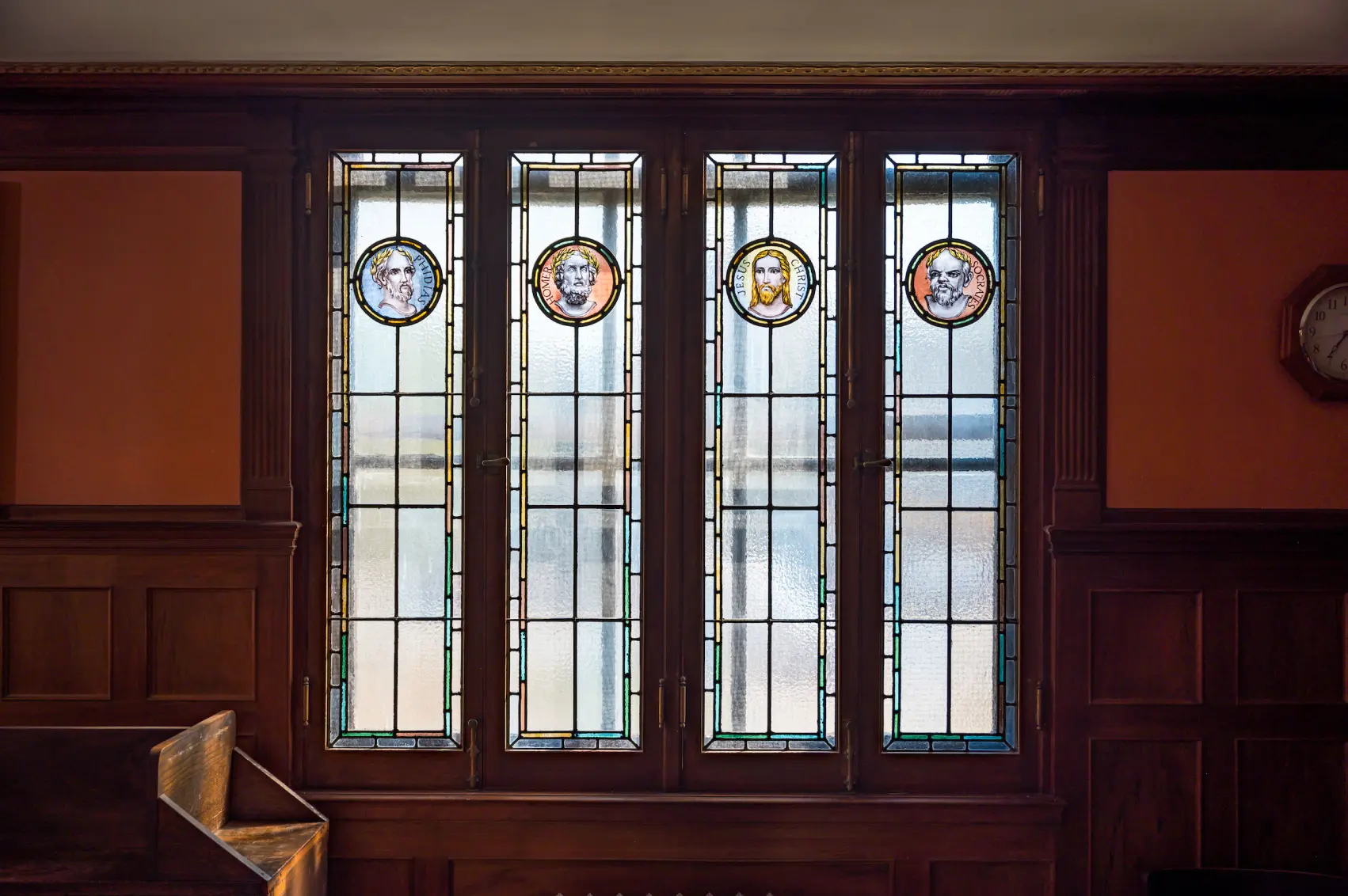 The stained glass windows feature medallions representative of the world’s great poets, writers and philosophers: Socrates (philosophy), Christ (religion) , Phidias (classical sculpture), Orpheus (music), Michelangelo (Renaissance sculpture), Shakespeare (dramatic verse), Galileo (science), Homer (epic poetry).