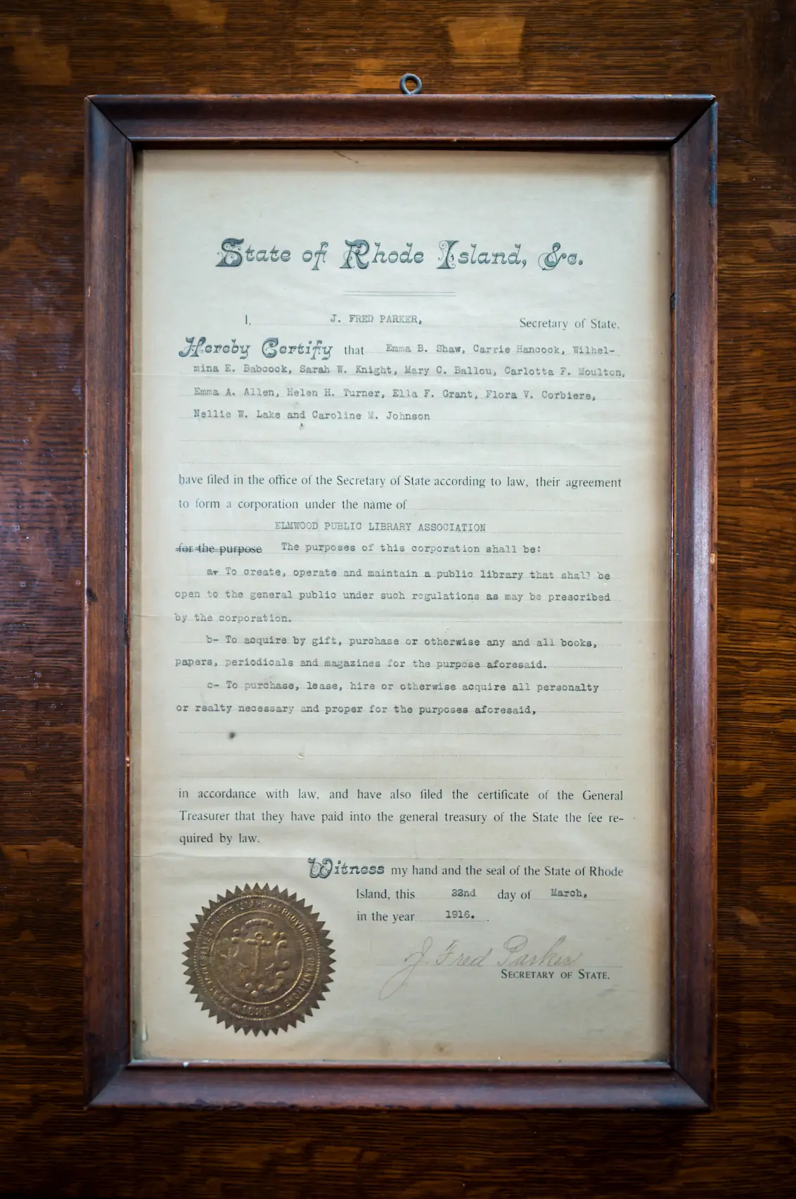 Mrs. Shaw organized and solicited her friends and neighbors for one dollar subscriptions to establish the Elmwood Public Library Association, and subsequently, a library was opened on the second floor of the Greenwich Street Fire Station in the neighborhood. The framed, original certificate of incorporation of the Association, dated March 22, 1916, can be viewed on the shelf. The city paid for renovations and covered the rent for the library to open in July 1915, for three afternoons a week, and on Saturdays until 9pm. The book collection of the first library, which began with just 1,000 books, was eventually transferred and greatly expanded in Knight Memorial.