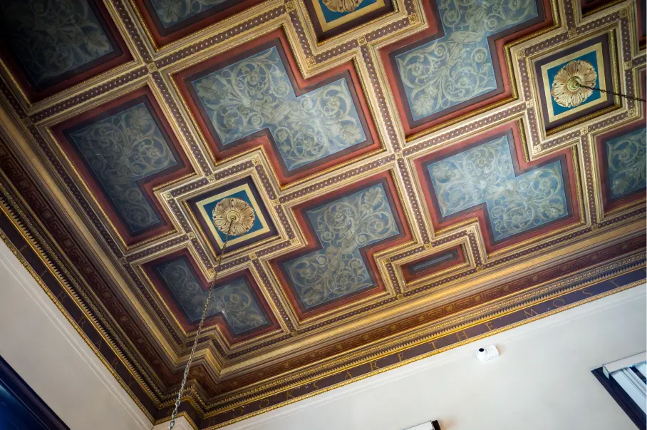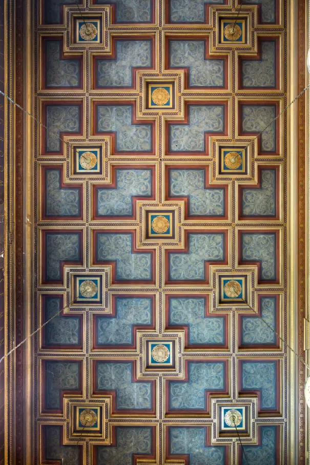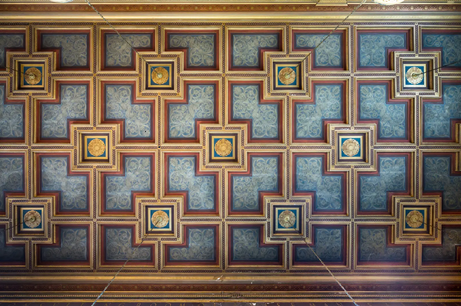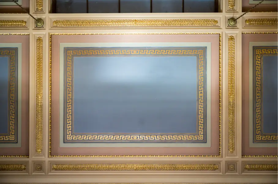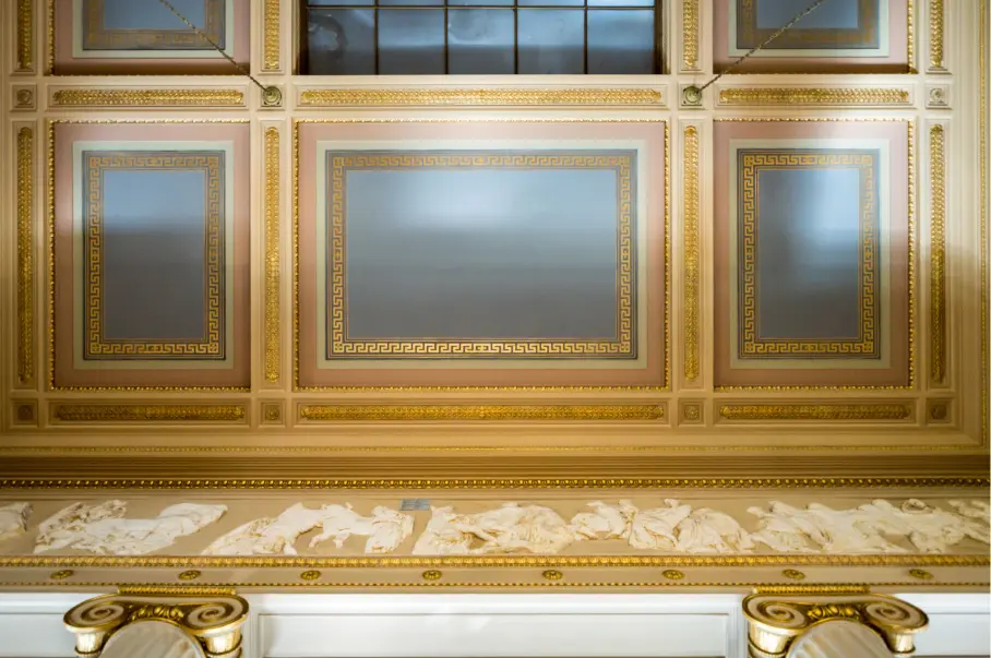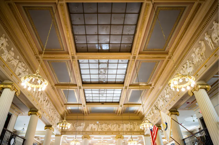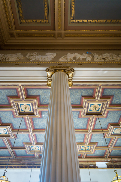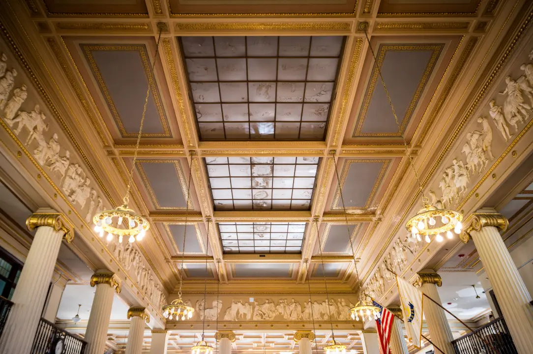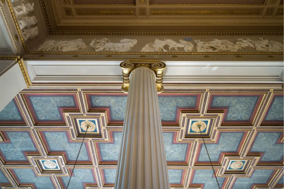 The neoclassical interior is conceived as the columned space of a Roman atrium, with a skylight and a coffered ceiling, a pattern of indentations or recesses in an overhead surface that became popular with Renaissance architects as they imitated Classical Roman techniques.