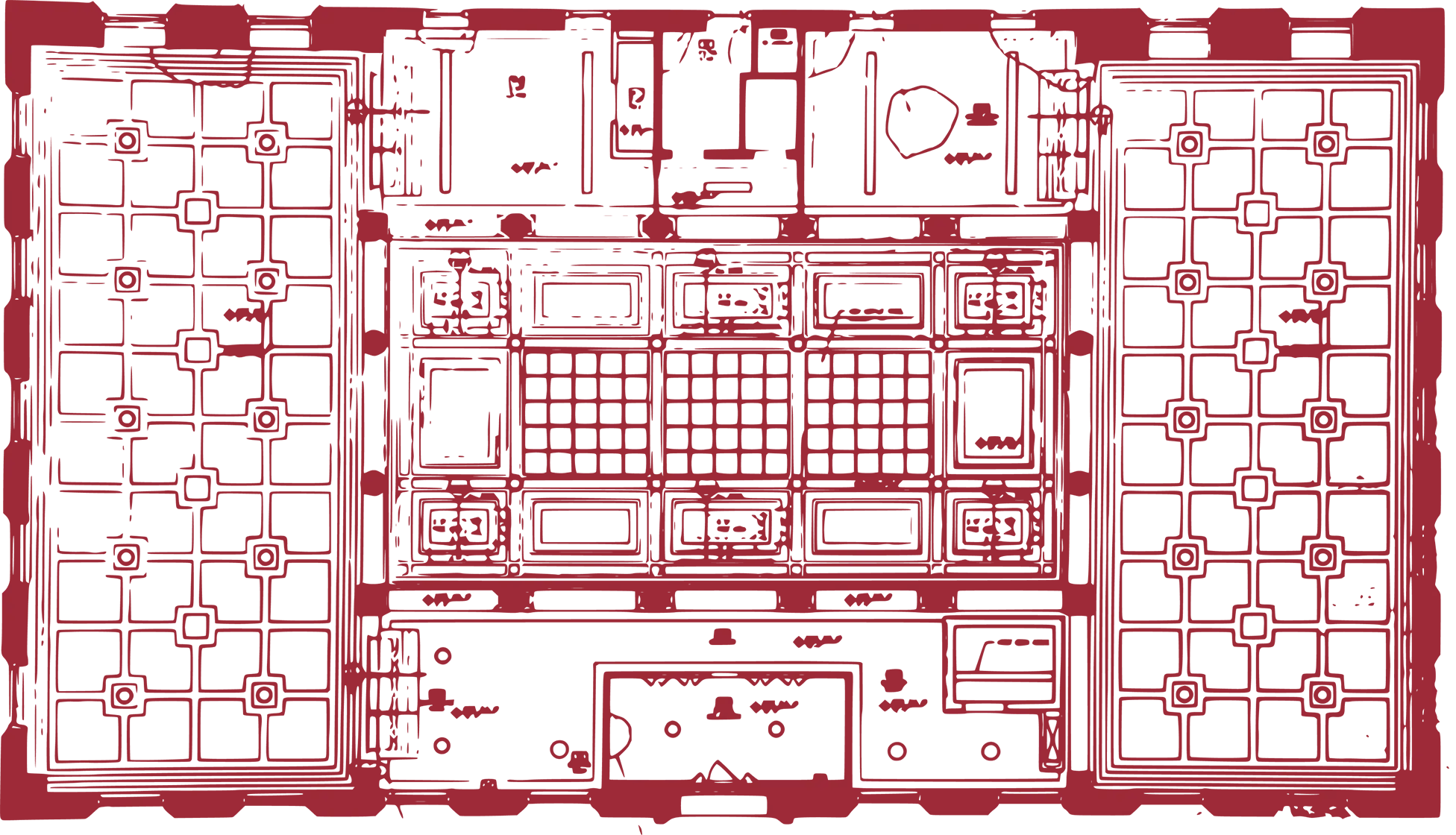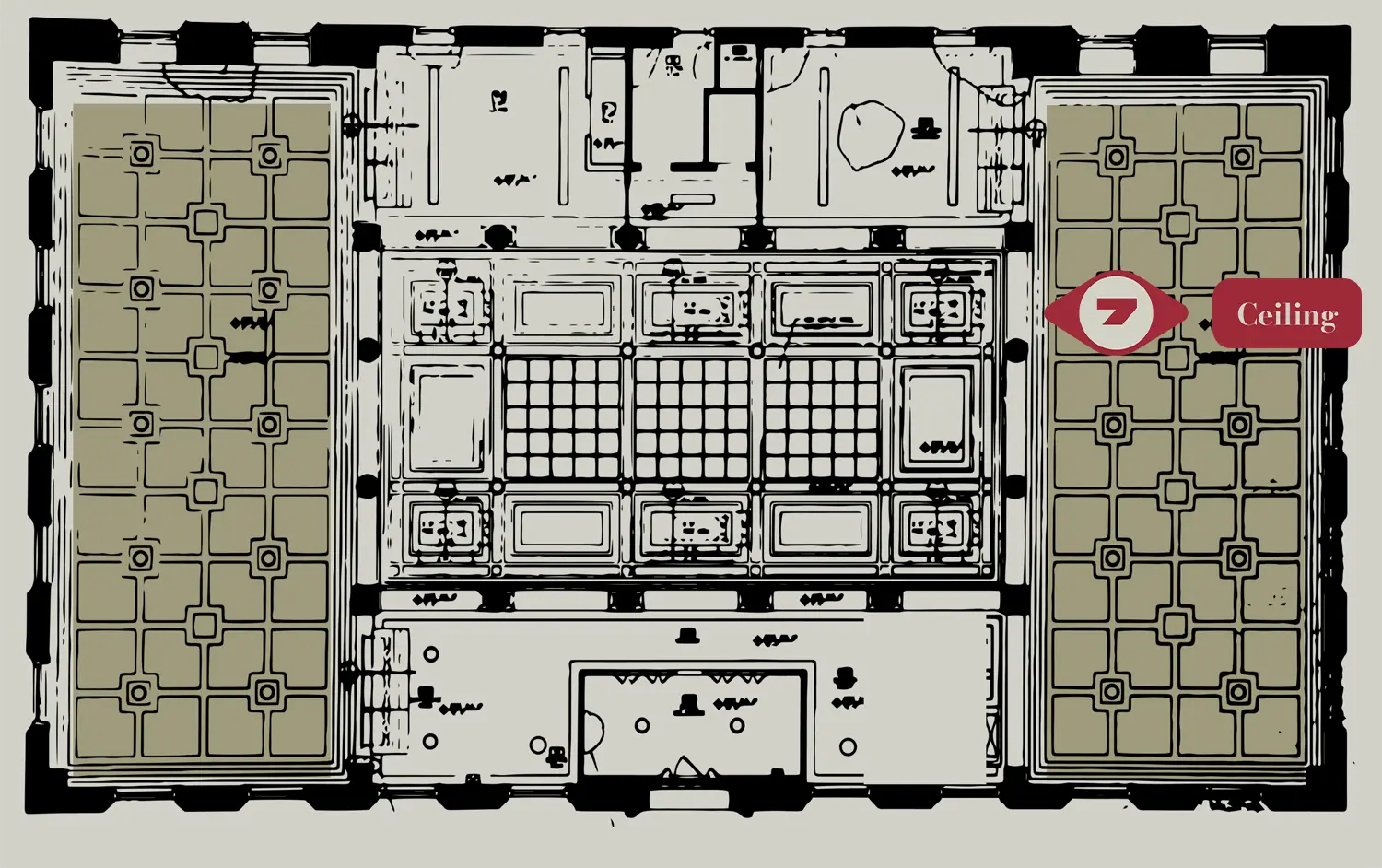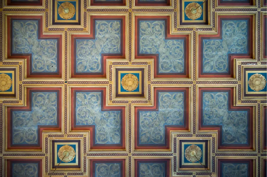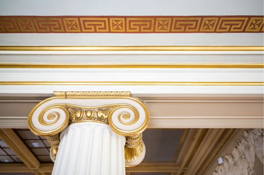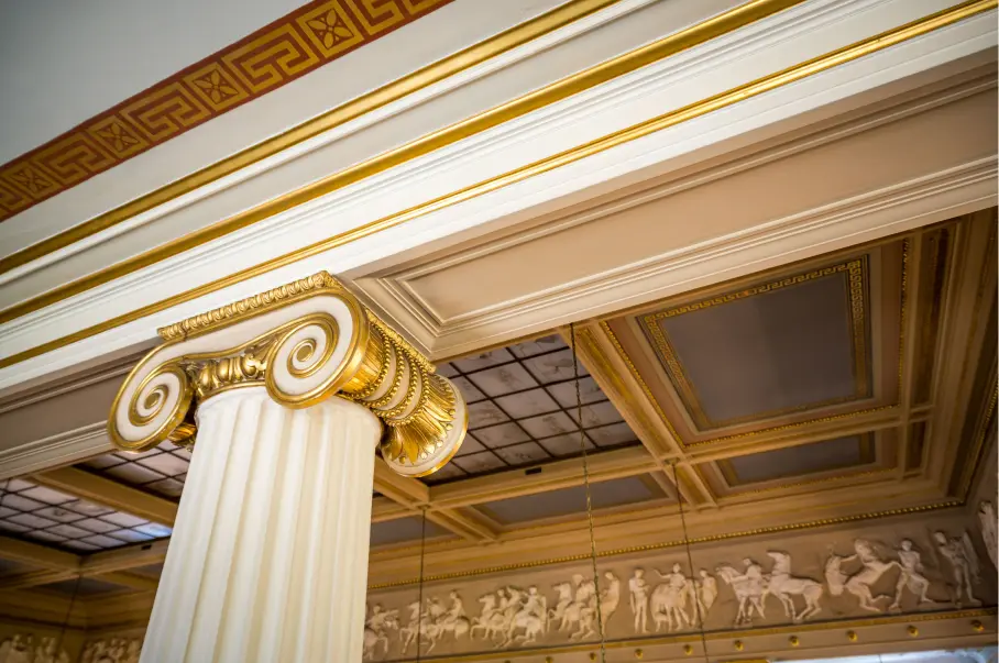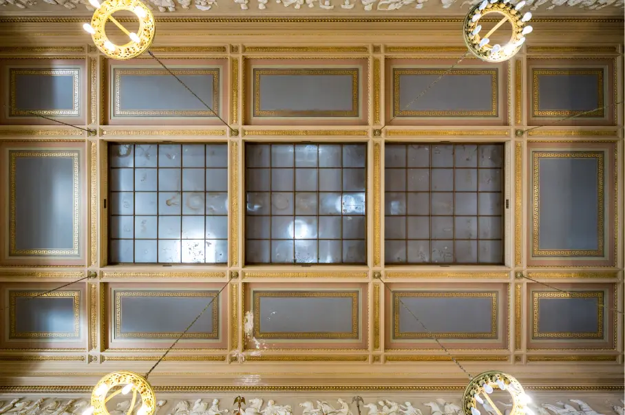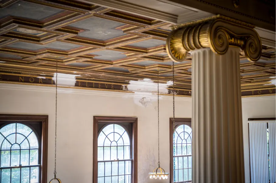 The neoclassical interior is conceived as the columned space of a Roman atrium, with a skylight and a coffered ceiling, a pattern of indentations or recesses in an overhead surface that became popular with Renaissance architects as they imitated Classical Roman techniques.