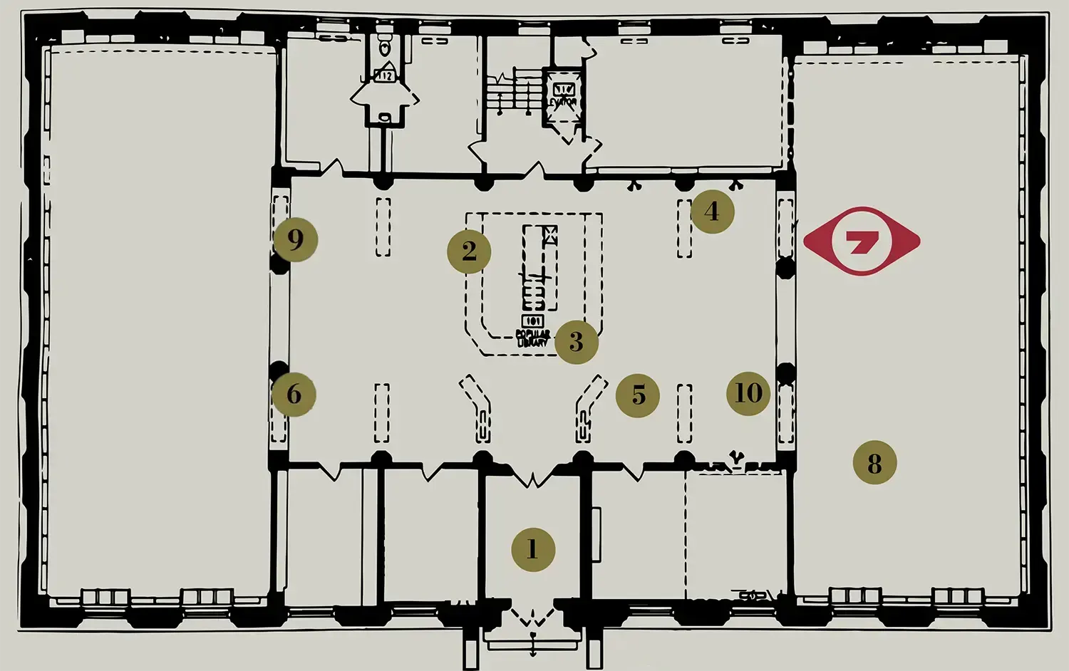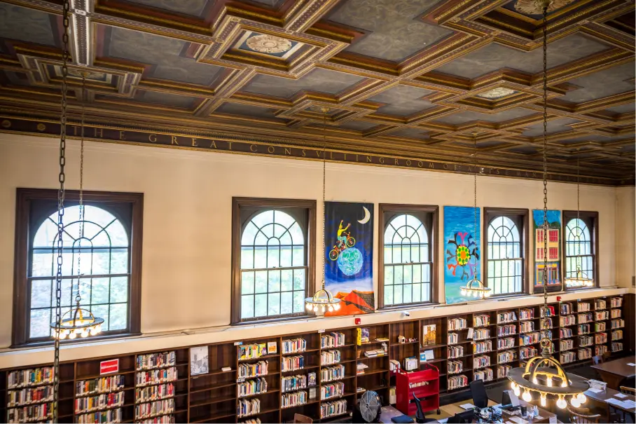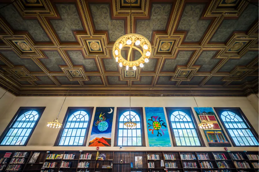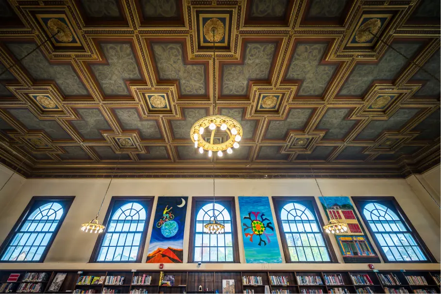 For the library’s founders, the grand classical design reflected Knight Memorial’s place as a sanctuary of learning, a haven of reading and study that also promoted moral behavior and good citizenship. The lofty ceilings of the former reading room (now the children's library area) and the reference room (now the adult library area) are decorated with borders of inspiring quotations from famous writers.
