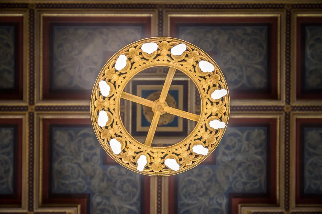 The skylight is currently covered from above, following a roof repair. The Pompeiian-style light fixtures originally had alabaster bulbs.