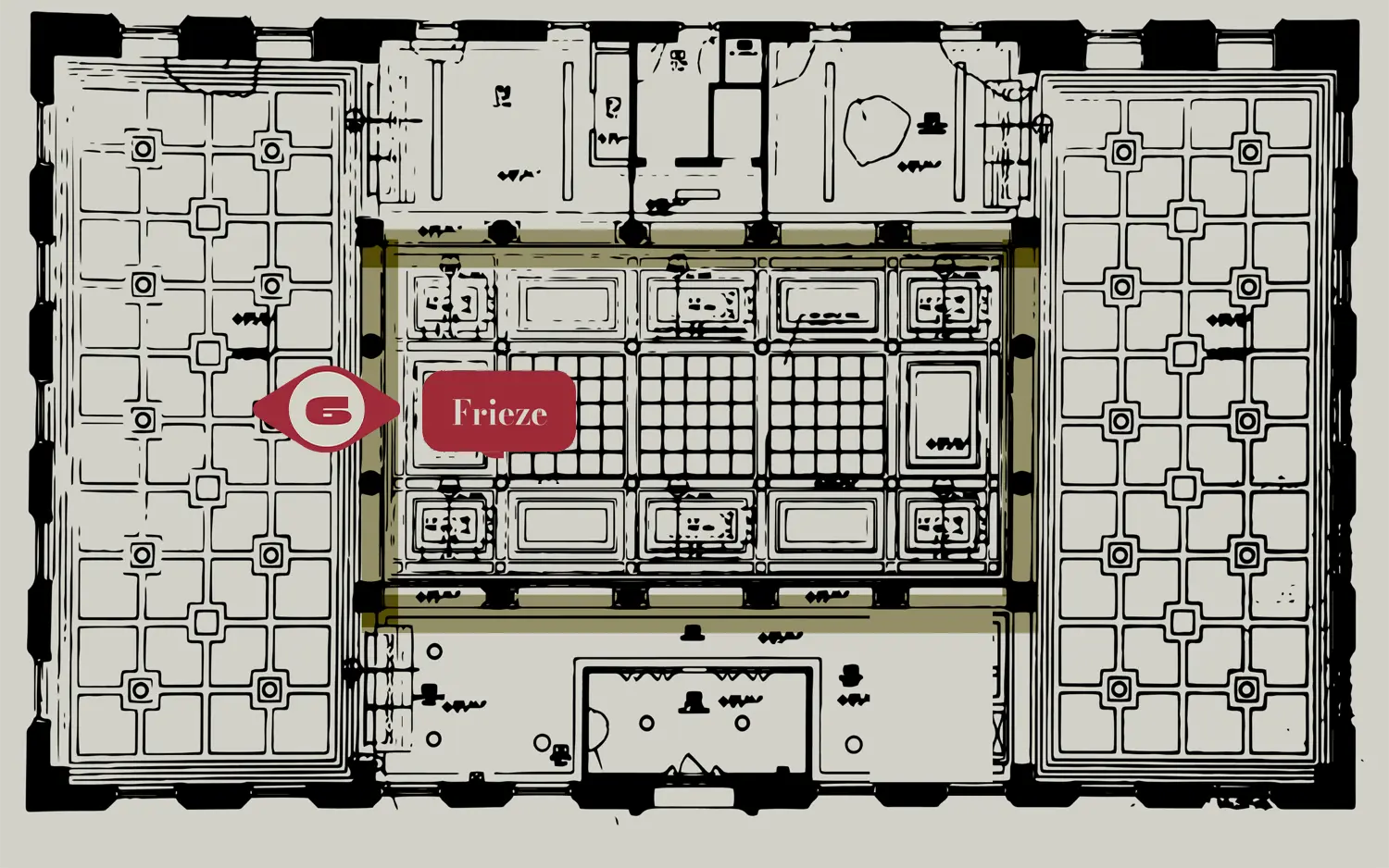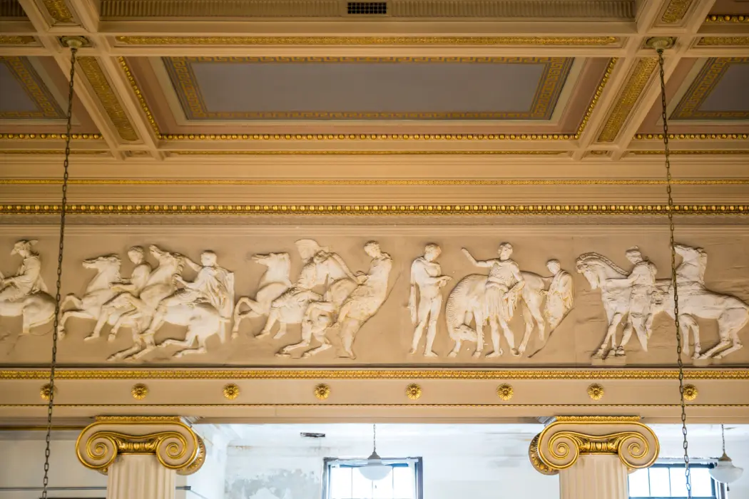 The casting of the plaster frieze in this building was done by renowned Italian craftsmen at the Caproni family workshop in Boston, based on molds from the original sculptures, which are now in the British Museum, London. The workshop continues as the Caproni Collection in Woburn Massachusetts, and still sells casts made from the early 20th century molds.