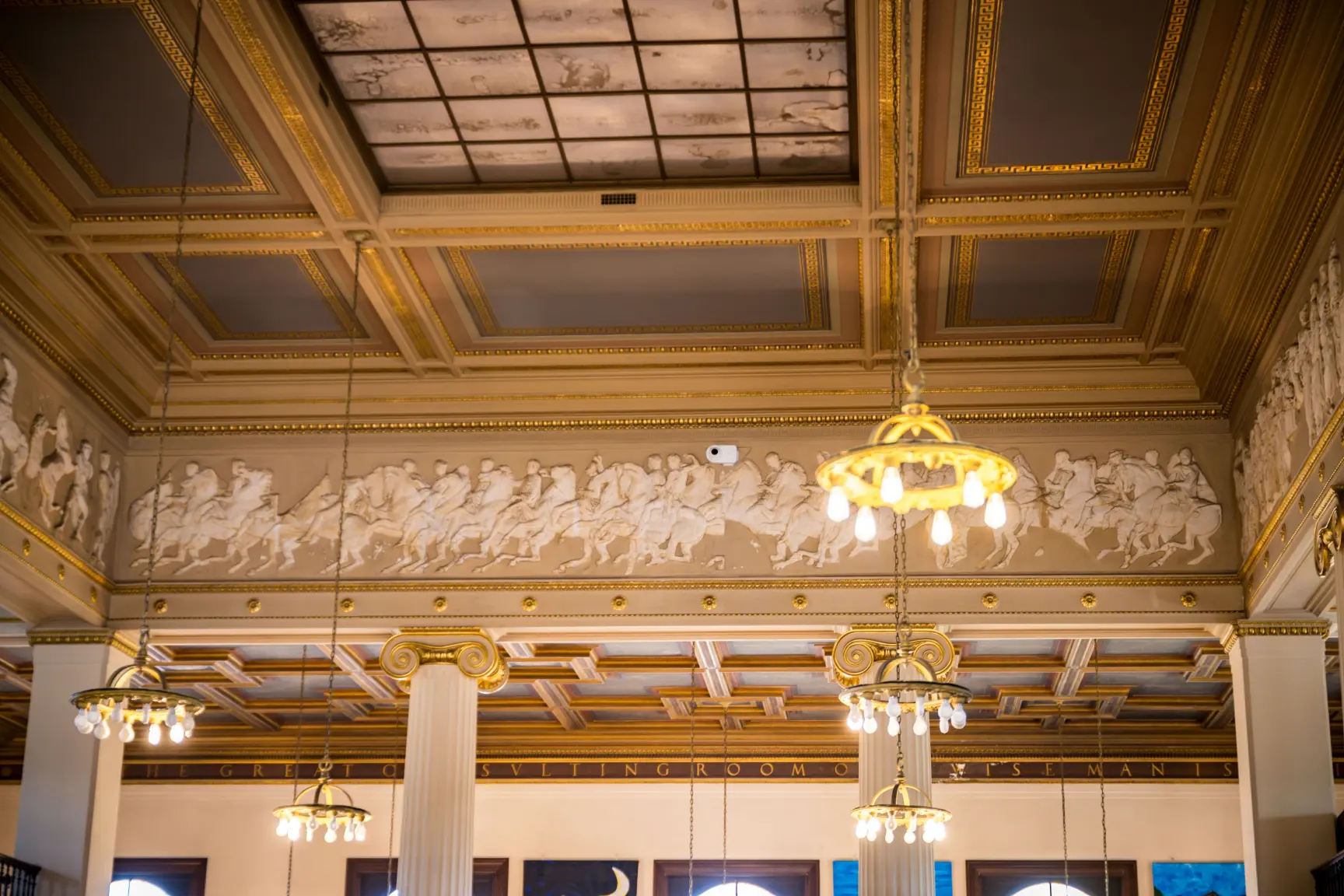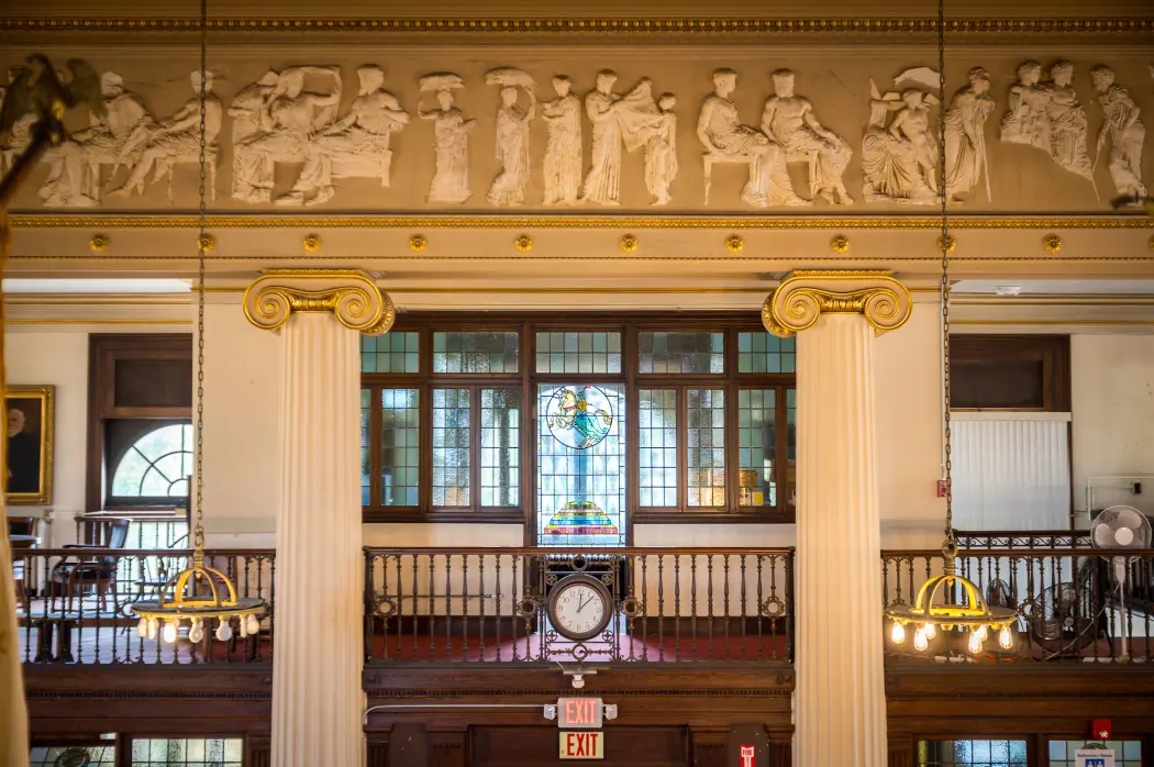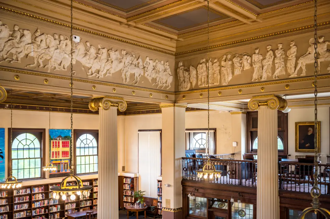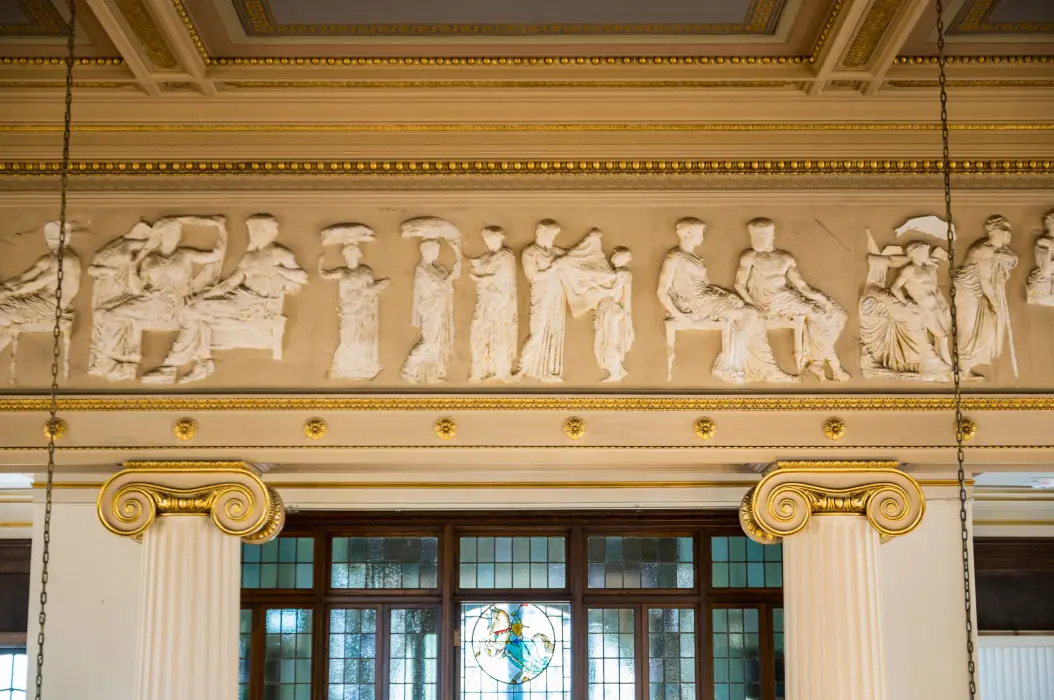The white plaster frieze that surrounds the top of the library’s circulation area was cast from the band of marble sculpture found in the Parthenon, a temple dedicated to the goddess Athena which was built in the 5th century BC on the Acropolis in Athens, Greece. Designed by the sculptor Phidias, and executed by many carvers, the Parthenon frieze, which originally would have been brightly painted, depicts scenes from the quadrennial festival of the Panathenaiaa, which celebrated Athena, the city's patron goddess.