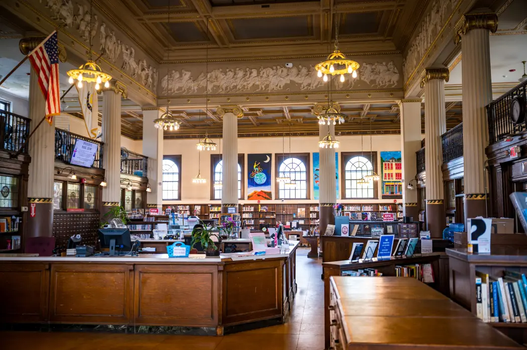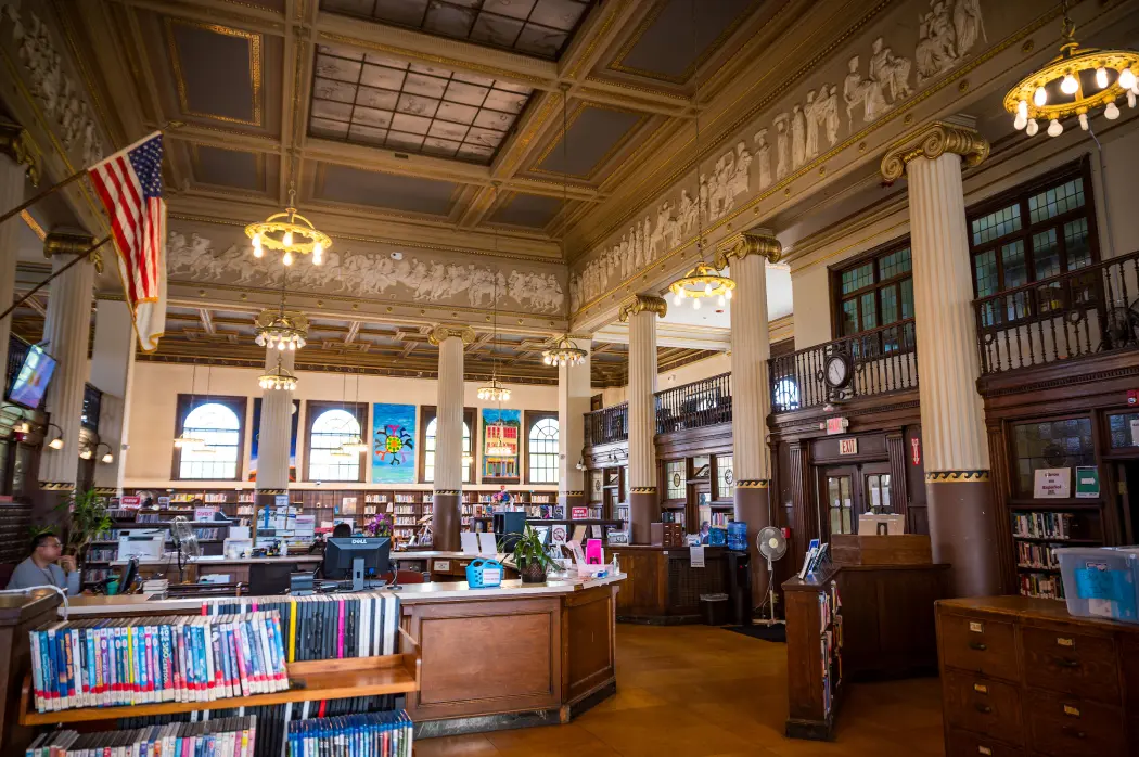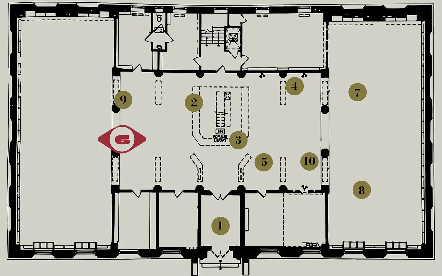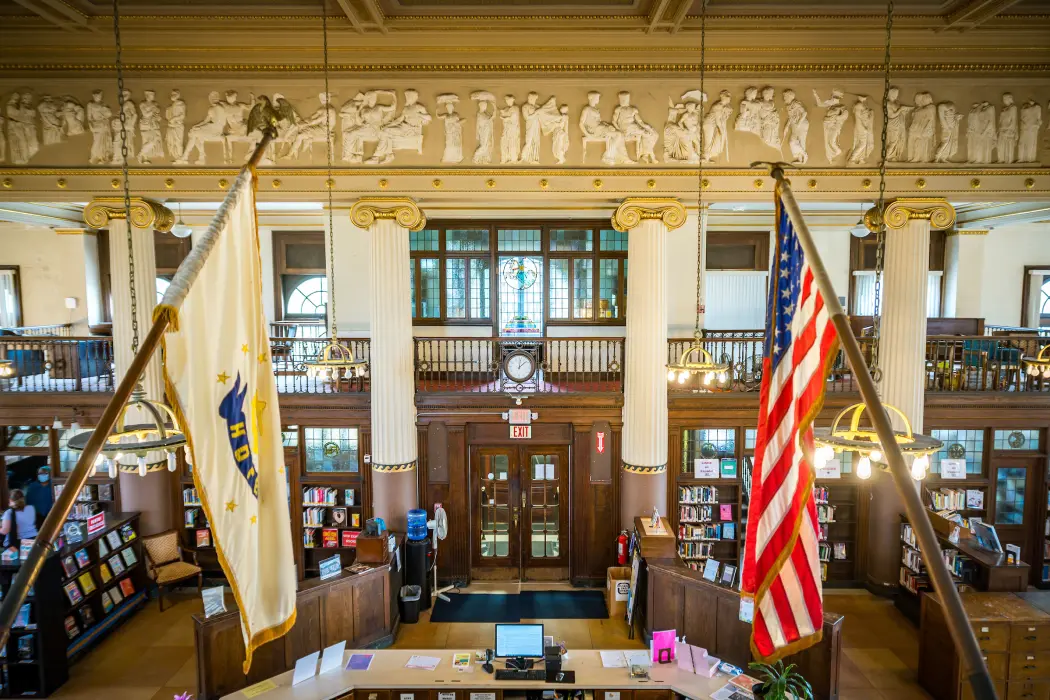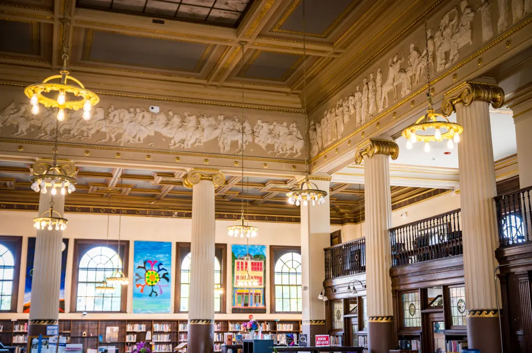 The white plaster frieze that surrounds the top of the library’s circulation area was cast from the band of marble sculpture found in the Parthenon, a temple dedicated to the goddess Athena which was built in the 5th century BC on the Acropolis in Athens, Greece. Designed by the sculptor Phidias, and executed by many carvers, the Parthenon frieze, which originally would have been brightly painted, depicts scenes from the quadrennial festival of the Panathenaiaa, which celebrated Athena, the city's patron goddess.