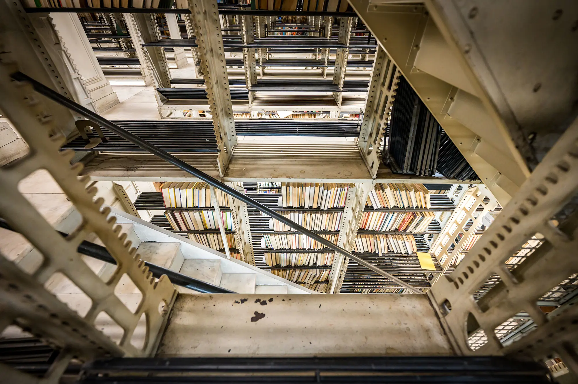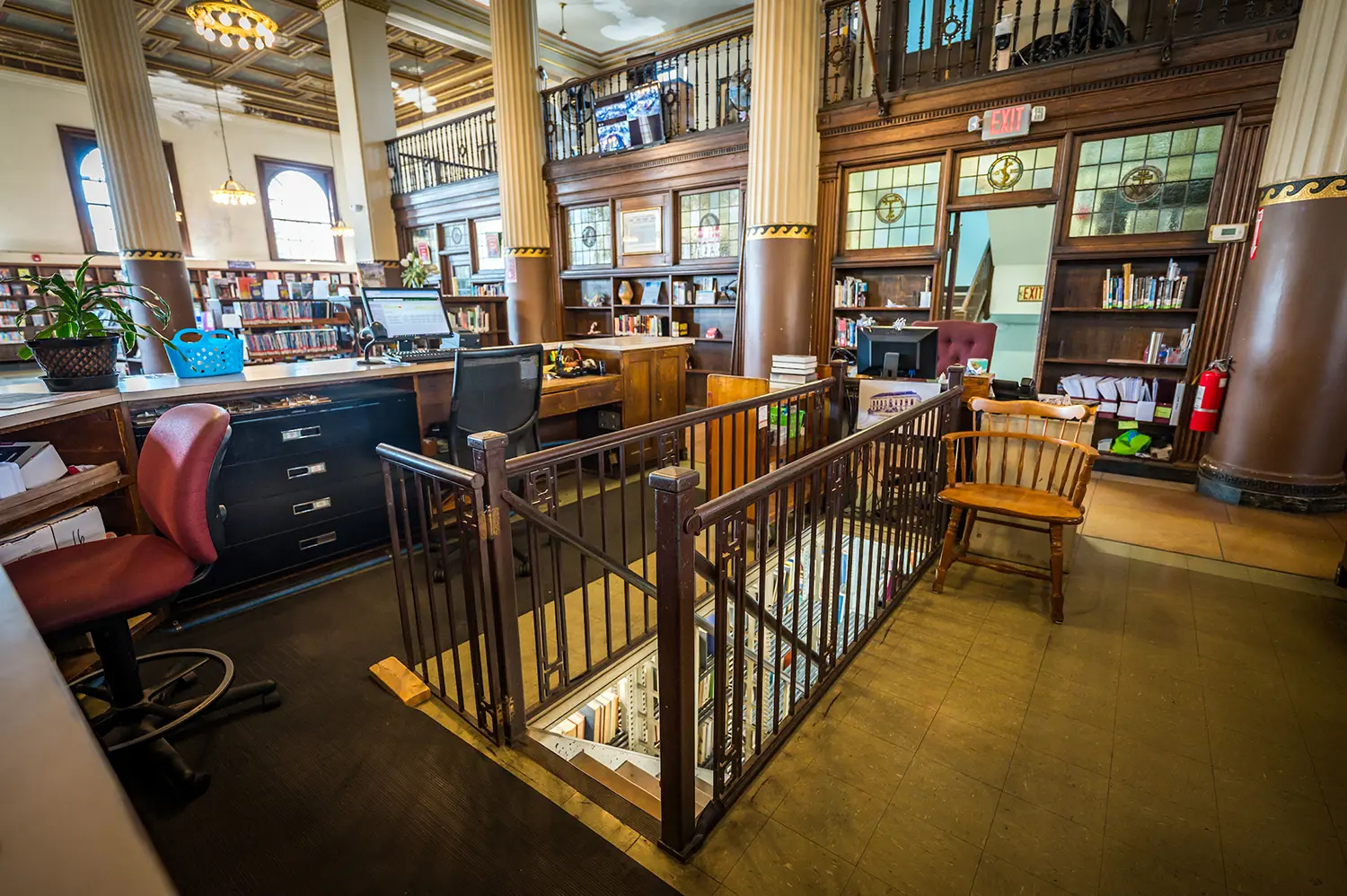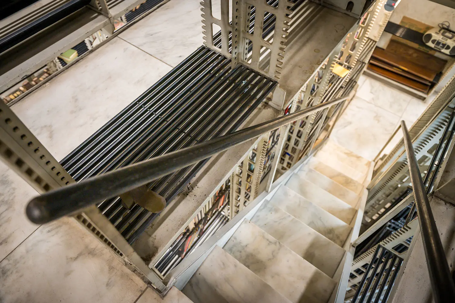 The doors of the original elevator, which linked all levels of the building, can be seen on the mezzanine level. A hand-cranked book elevator was also used to transport materials between floors.